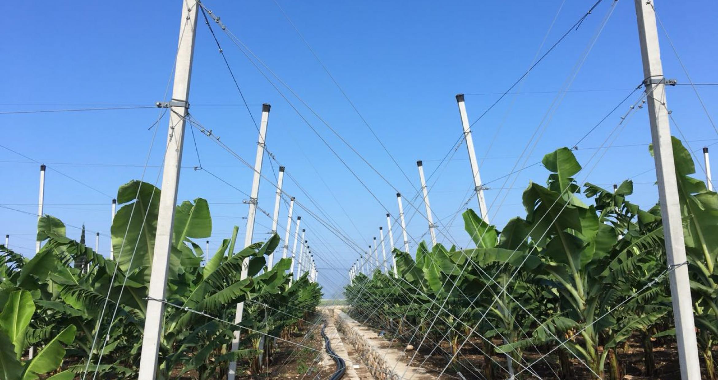 Safety structure, using very light and agile nets. A shelter from the wind and hail. Beyond protection from weather hazards, net houses for bananas provide better growth conditions of seedlings after planting. Structure includes the trellis and a support system for growth of the banana plants. Better utilization of land. Easier cultural practices. Protection from insects. Water saving by preventing evaporization. Higher crop production of better quality fruits. Low labor cost.