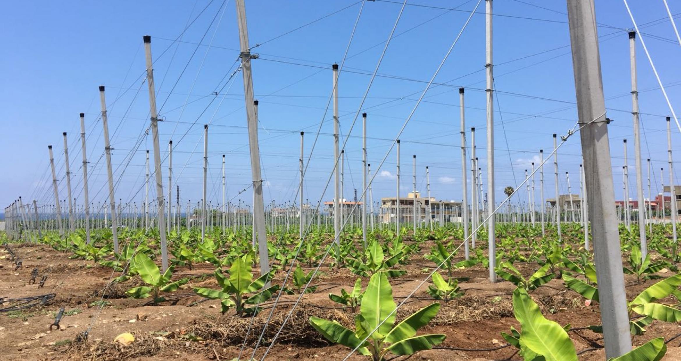 Safety structure, using very light and agile nets. A shelter from the wind and hail. Beyond protection from weather hazards, net houses for bananas provide better growth conditions of seedlings after planting. Structure includes the trellis and a support system for growth of the banana plants. Better utilization of land. Easier cultural practices. Protection from insects. Water saving by preventing evaporization. Higher crop production of better quality fruits. Low labor cost.